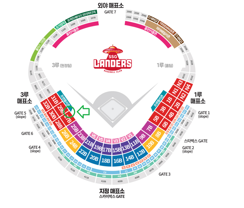 인천 SSG 랜더스 필드 (문학구장)은 남쪽 방향을 바라보고 있는 경기장 이므로 3루가 원정석 입니다. 응원단상은 위 좌석 배치도에 화살표 표시된 27B구역과 29B구역 사이에 위치하고 있는데요 인기있는 경기의 경우 예매하기가 보통 힘든 것이 아닙니다.