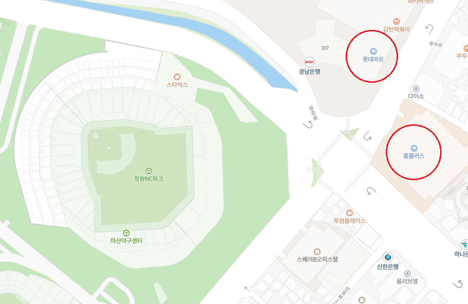 NC파크 맞은편에는 대형마트가 두 곳이나 있다. 이 곳 주차장에 주차 하는 것이 오랜 줄을 서서 NC파크 주차장에 주차하는 것보다 오히려 간편할 수도 있다.