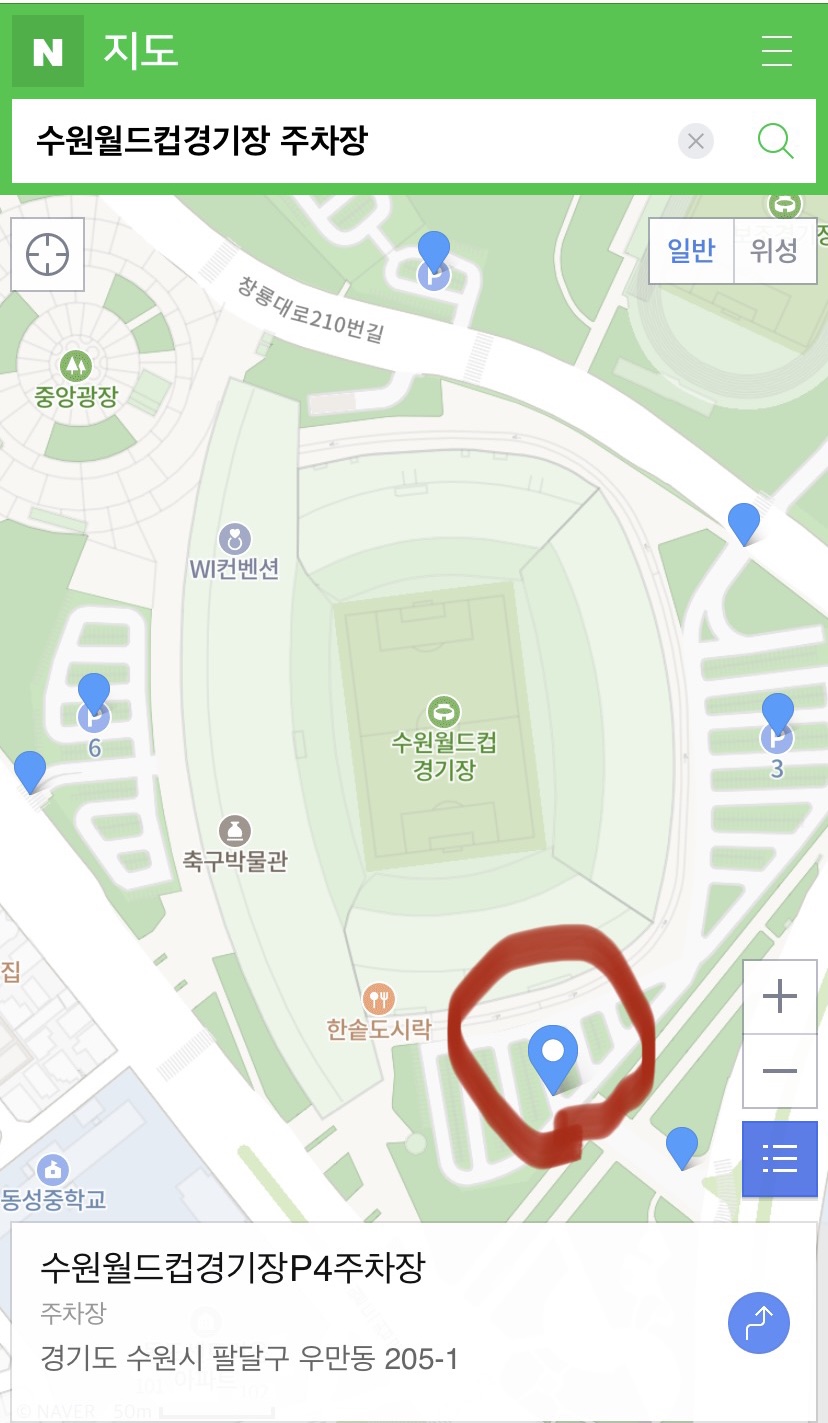 주차장을 찾기 위해 “수원월드컵경기장 주차장” 이라고 치면 많은 주차장이 나오는데 그 중 위 지도에 나오는 P4 주차장에 주차를 하면 원정석 입구 바로 앞에 주차가 가능하다.