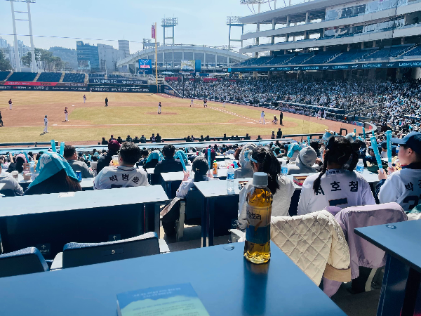 경기가 시작 되었다. 역시 뷰는 정말 좋다. 가까이서 선수들의 움직임이 잘 보인다. 무엇보다 테이블이 있어서 너무마 편하다. 나는 테이블 석에 앉는다고 하더라도 음식을 잘 먹지 않는다. 집중할때 먹는 습관이 없기 때문에 오직 물 한통 들고 테이블 석에 앉았다. 음식을 먹지 않고 그냥 빈 테이블만 앞에 있다고 하더라도 일반석과는 그 편안함이 하늘과 땅차이다.
